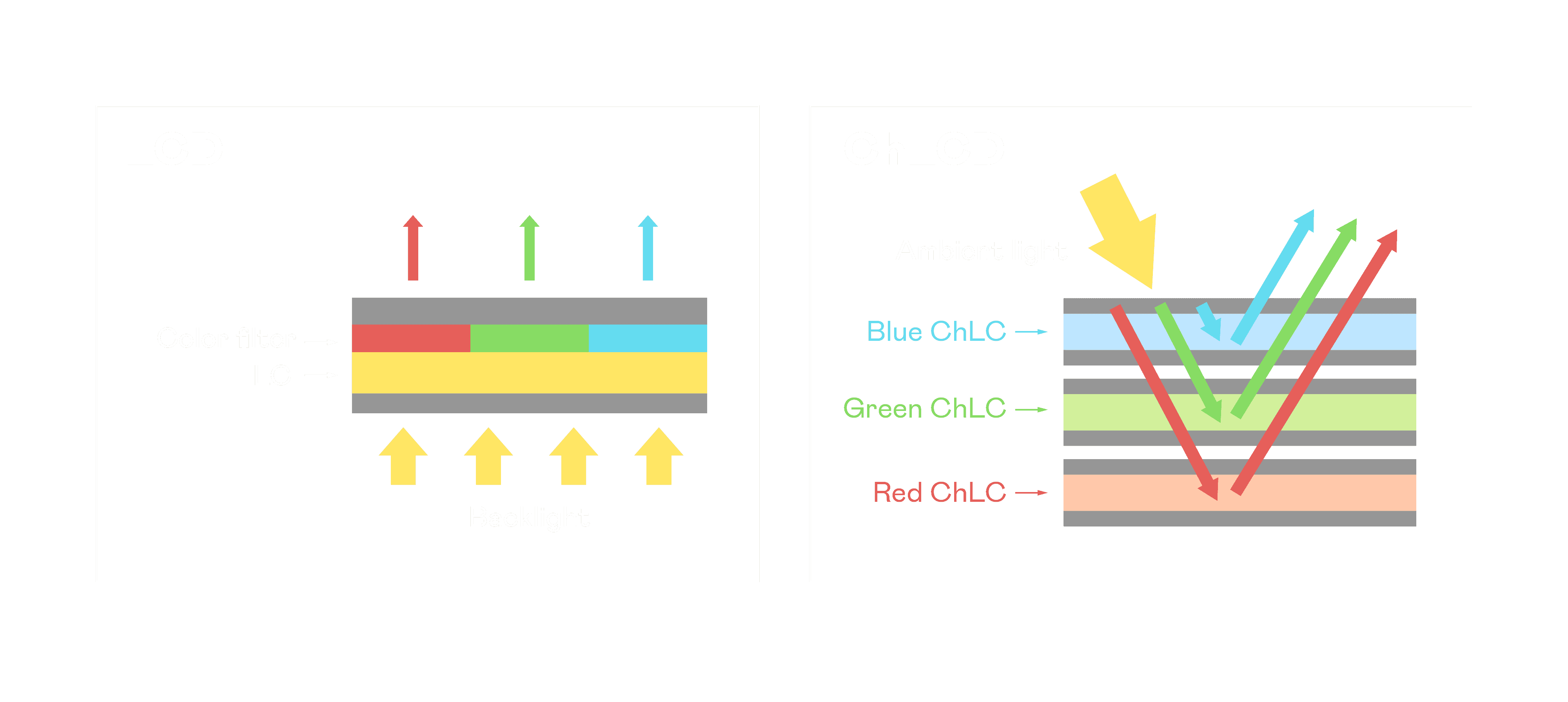 ChLCD 胆固醇液晶就如同纸张一样,,透过反射环境光来显示影像,,,因此长时间观看不易造成人眼视觉疲劳,,,,可达到护眼效果。。当处于户外阳光下使用,,,LCD 影像容易失真而不易观看,,但胆固醇液晶仍可维持较佳的影像品质。。。